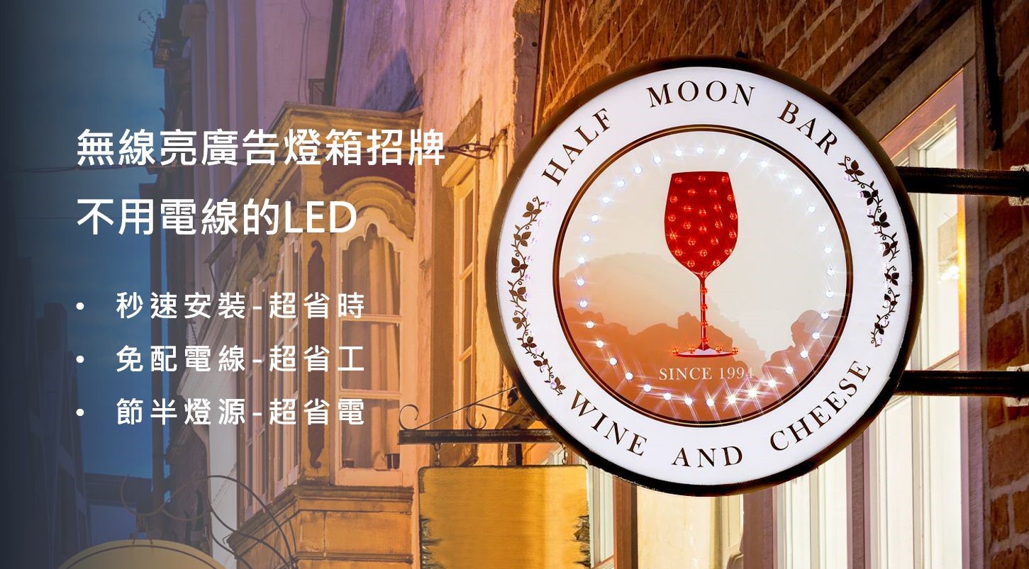無線亮燈箱招牌使用「光粒子」技術,讓燈箱不用電線就能發出如LED般的閃亮效果 ,讓我們的廣告燈箱、招牌,不再被麻煩的接電線問題所束縛。
